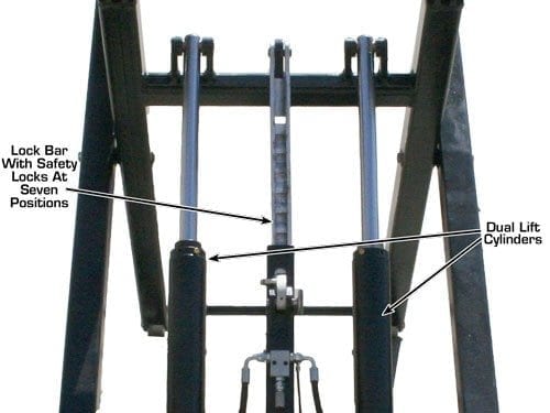 The dual power cylinders and the solid safety lock bar, with several different lock positions, make the Atlas® 6MR one of the most popular mid-rise lifts sold in the USA and Canada.