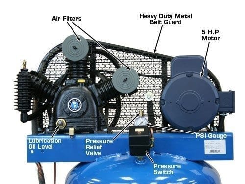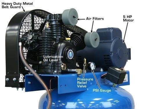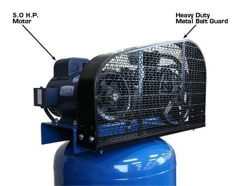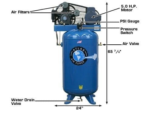 The Atlas® Air Force AF6 is a entry level commercial grade two (2) stage vertical air compressor. This unit operates between 145 and 175 PSI and will run our Atlas® line of sandblast cabinets (when using Medium or Medium-Fine glass bead). The combination of the commercial grade low RPM motor and the heavy duty 3 cylinder (2 cylinders are low pressure and 1 cylinder is high pressure) cast iron reciprocating air compressor pump delivers an incredible amount of air volume and air pressure for a very low price.