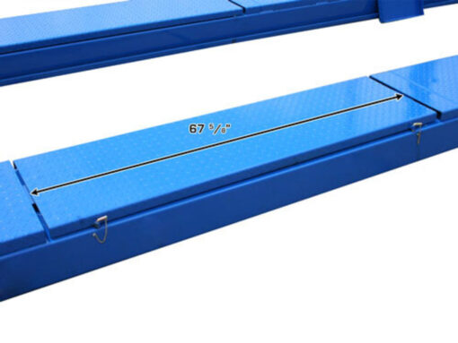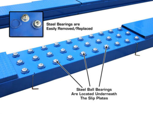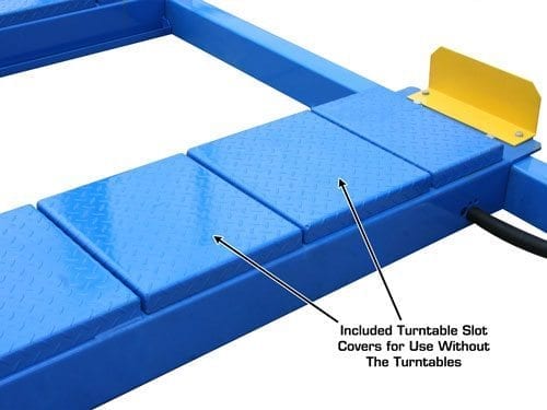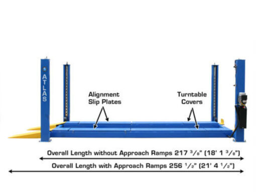 Besides having all the heavy duty features of the Atlas® 414, such as “tracks” between the runways to allow the use of a rolling bridge jack (the Atlas® RJ8000BK) on the lift (rolling jacks sold separately) the 414A features slip plates and alignment turntables. The slip plates are built in and are assured to be level with the turntables. The turntables can be set in different positions on the runway to accommodate a wide variety of wheelbases. The 414A also features metal cover plates to replace the turntables when not in use and so the lift can be used for more than just alignments.